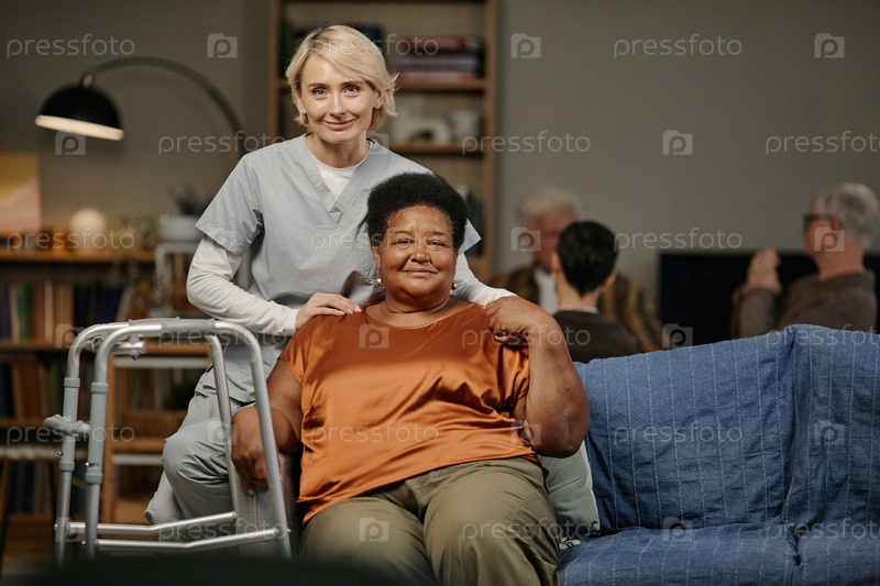 Портрет старшей чернокожей женщины, сидящей с женским опекуном и улыбающейся