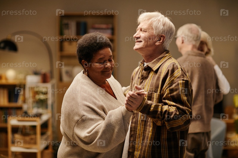 Мужчина и старшая чернокожая женщина танцуют вместе в доме престарелых