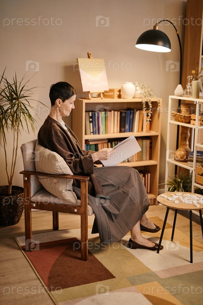 Женщина сидит и читает документ в доме престарелых Senior Setting