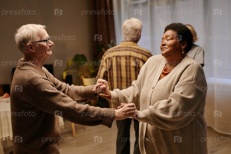 Старший мужчина и старшая чернокожая женщина держатся за руки и танцуют вместе