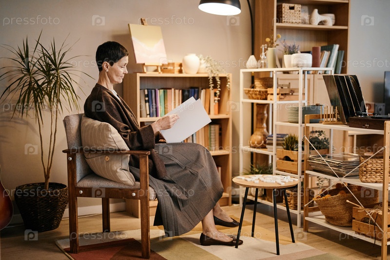 Пожилая женщина сидит в доме престарелых, читает книги и расслабляется