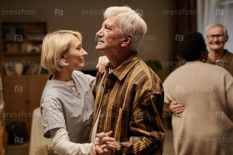 Старший мужчина танцует с молодой взрослой женщиной в доме престарелых