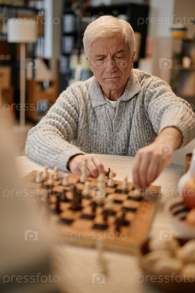 Мужчина концентрируется, играя в шахматы в доме престарелых