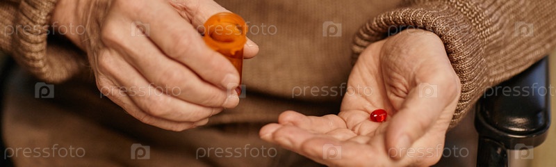 Глава пожилого человека, держащего бутылку с таблетками и принимающего лекарства в доме престарелых