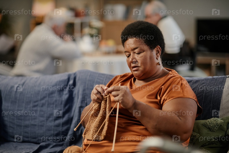 Черная женщина вяжет, сидя на диване в доме престарелых