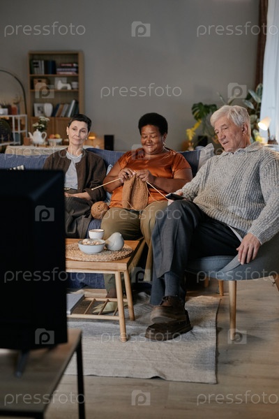 Группа пожилых женщин и мужчин, смотрящих телевизор в доме престарелых