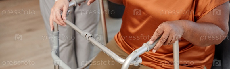 Глава старшей чернокожей женщины, держащей ходунка, получающей поддержку от опекуна
