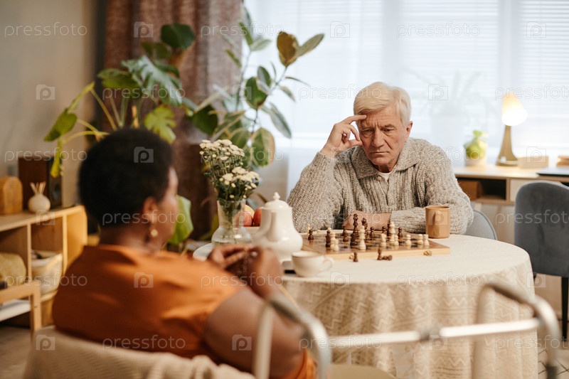 Мужчина концентрируется, играя в шахматы со старшей чернокожей женщиной