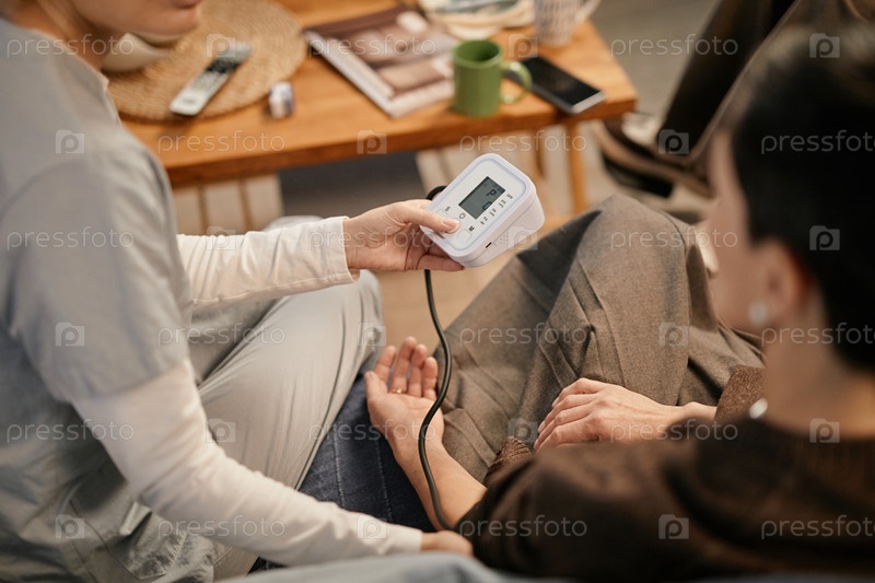 Медсестра проверяет кровяное давление пожилой женщины в доме престарелых