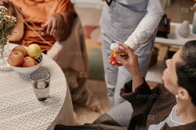 Женщина, получающая лекарства от медсестры в доме престарелых Senior Setting