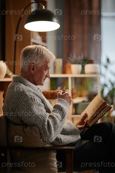 Старший мужчина сидит в помещении, читает книгу и пьёт горячий напиток