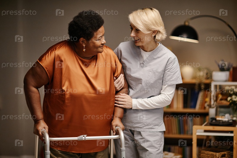 Чёрная женщина, использующая ходунка с помощью женского опекуна улыбается