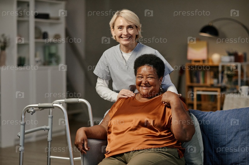 Сестра поддерживает старшего чернокожего женщину, улыбающуюся в доме престарелых