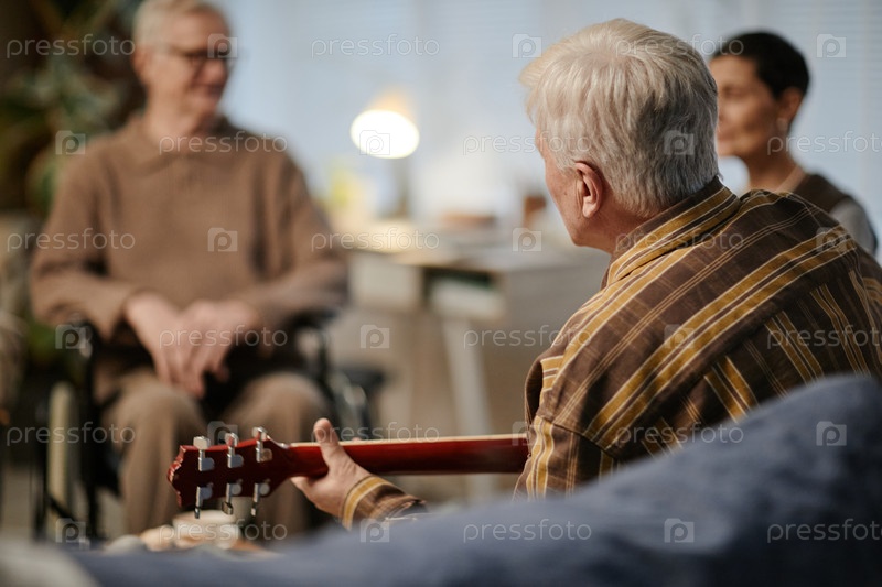 Мужчина играет на гитаре, развлекая пожилых людей в доме престарелых