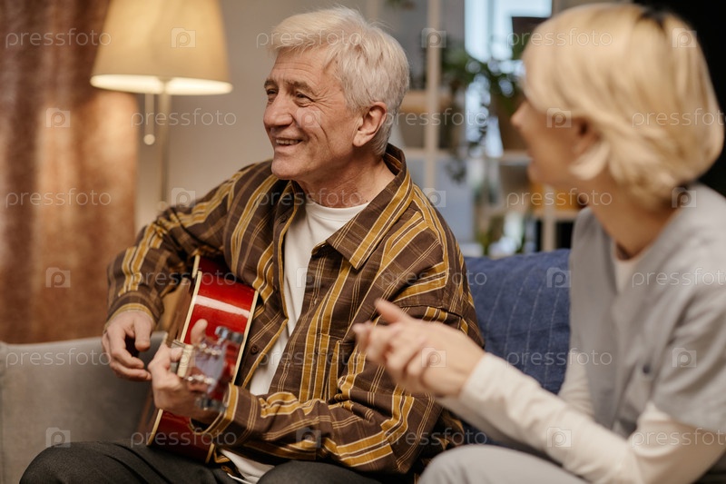 Мужчина играет на гитаре, разговаривая с молодой взрослой женщиной