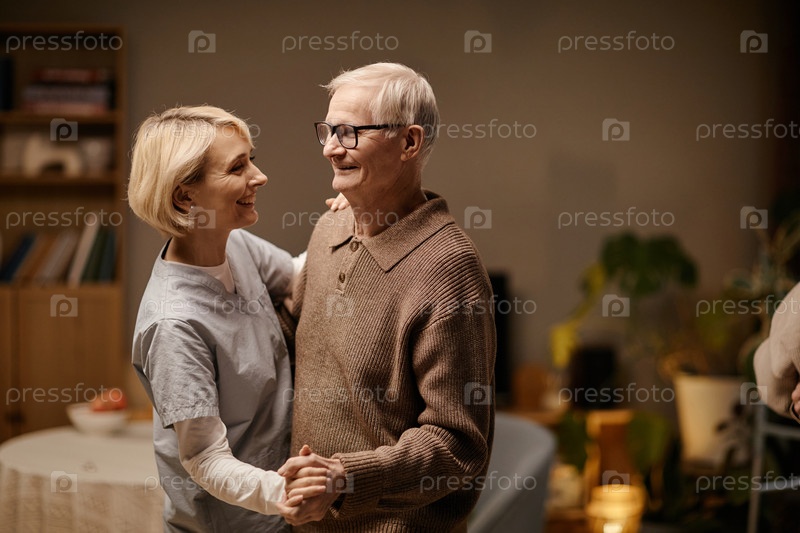 Старший мужчина танцует с молодой взрослой женщиной-опекуном, улыбающейся