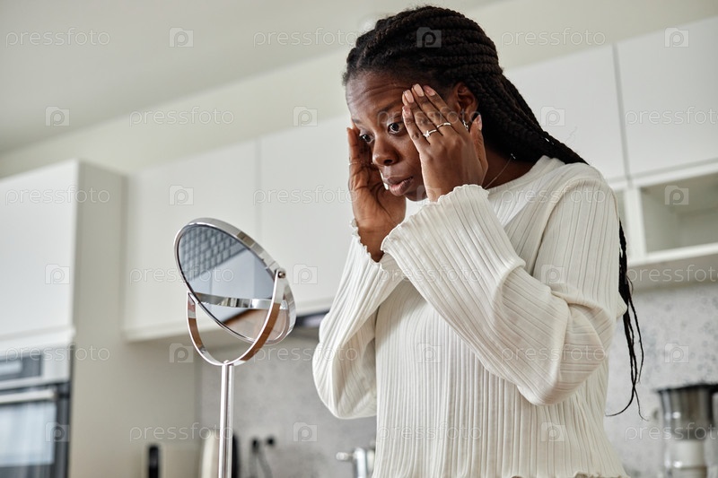 Молодая чернокожая женщина, осматривающая лицо в зеркале с озабоченным выражением