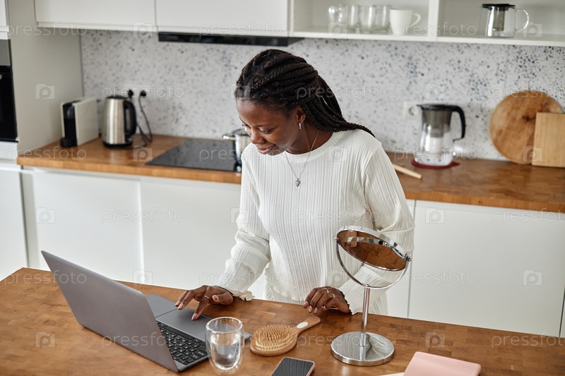 Молодая чернокожая женщина улыбается, используя ноутбук на современной кухне