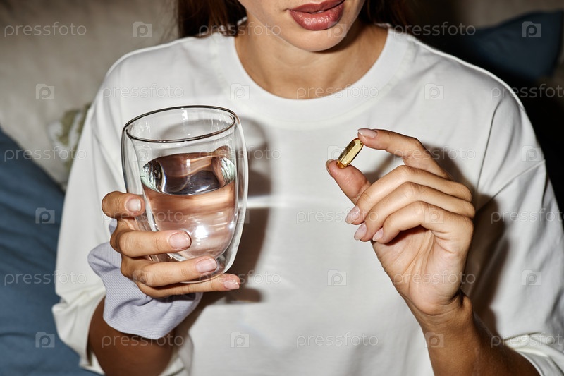 Молодая женщина держит стакан воды и принимает капсулу в помещении