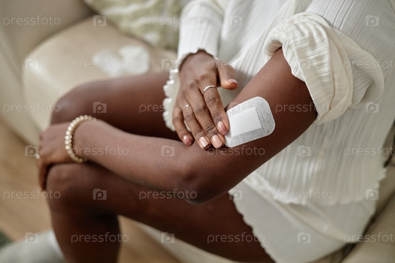 Молодая чернокожая женщина накладывает клейкую повязку на руку