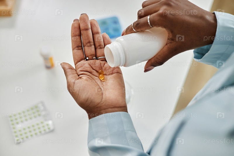 Черная женщина наливает капсулы в пальму из бутылки с лекарствами