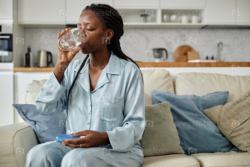 Молодая чернокожая женщина сидит на диване, пьет воду и принимает лекарства