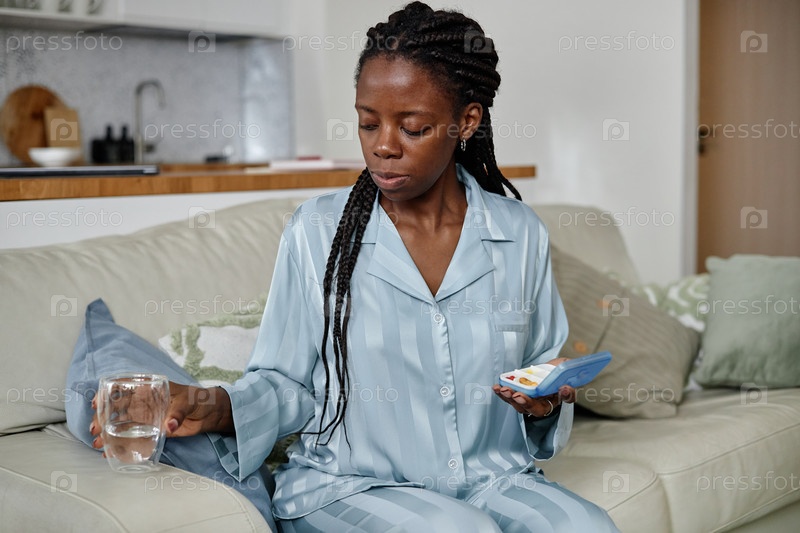 Молодая чернокожая женщина сидит на диване, держит лекарства и питьевую воду