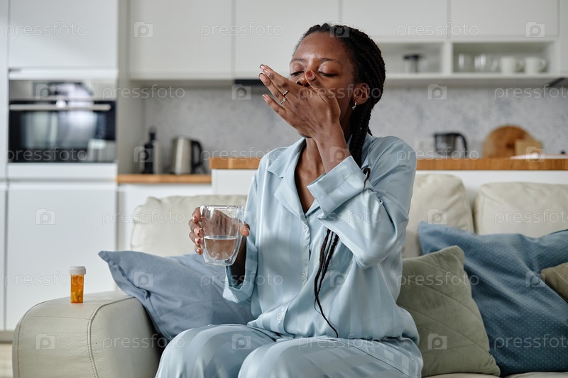 Молодая чернокожая женщина принимает лекарства с водой, сидя в помещении