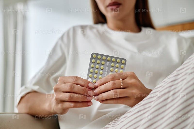 Молодая женщина держит пузырь пакет оральных противозачаточных таблеток