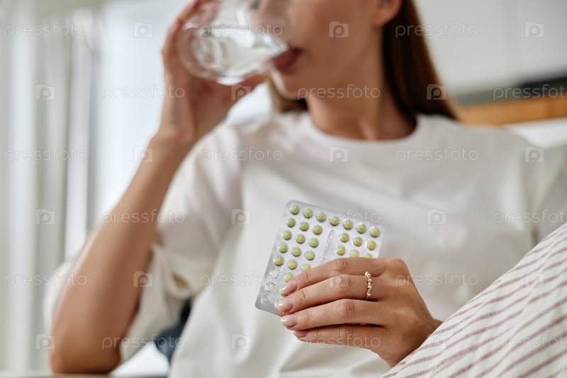 Молодая женщина принимает оральные противозачаточные таблетки, выпивая воду