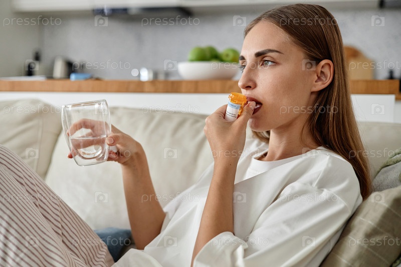 Молодая женщина принимает лекарства, сидя дома на диване