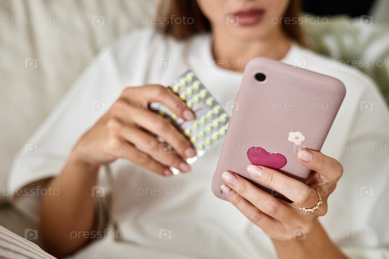 Молодая женщина держит таблетки при использовании смартфона в помещении