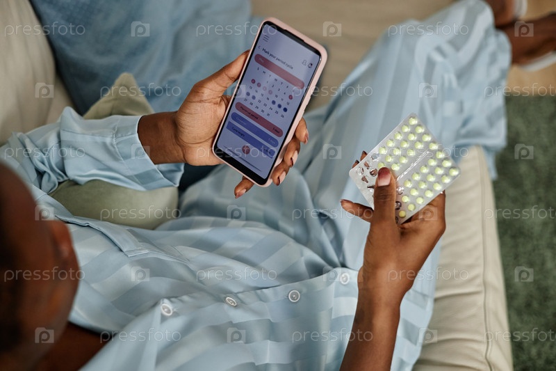 Молодая чернокожая женщина проверяет расписание приема лекарств на смартфоне дома