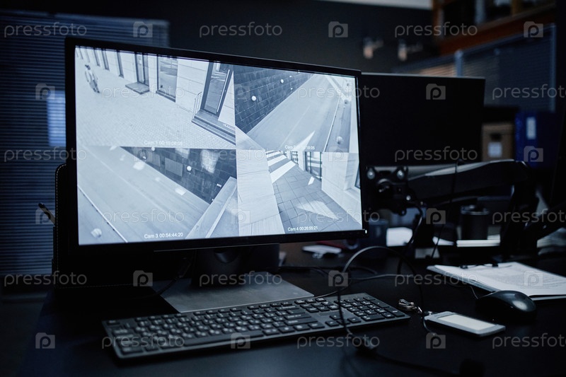 Камеры видеонаблюдения отображают пустые городские улицы на компьютерном мониторе