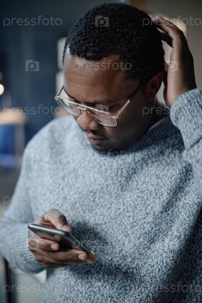 Чернокожий мужчина среднего возраста, использующий смартфон во время царапины головы в помещении