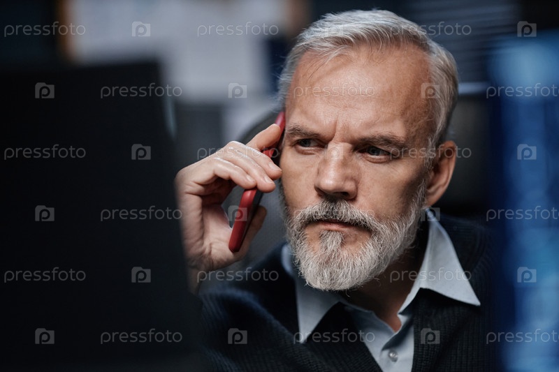 Портрет человека, разговаривающего со смартфоном в офисной обстановке