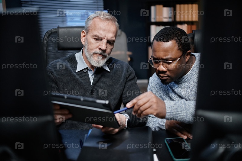 Мужчина среднего возраста и молодой чернокожий человек сотрудничают над цифровым планшетом