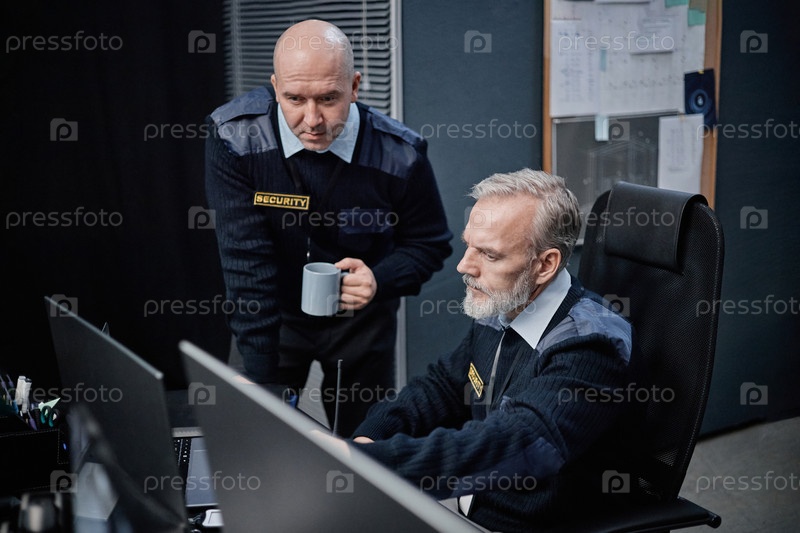 Охранники среднего возраста вместе следят за записями видеонаблюдения