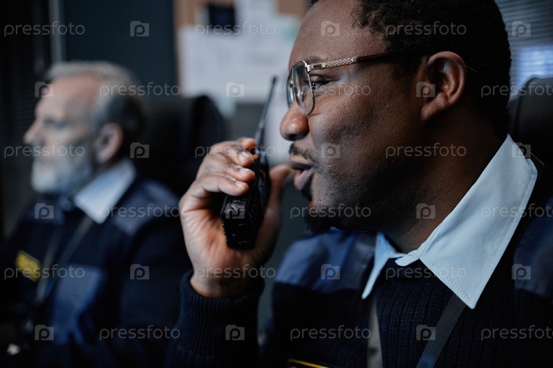 Чернокожий мужчина среднего возраста, общающийся с помощью прослушки в комнате управления