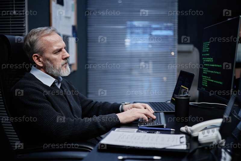 Мужчина средних лет работает на компьютере в современном офисе ночью