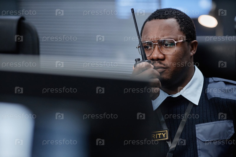 Чернокожий мужчина среднего возраста отслеживает системы безопасности при использовании прослушки