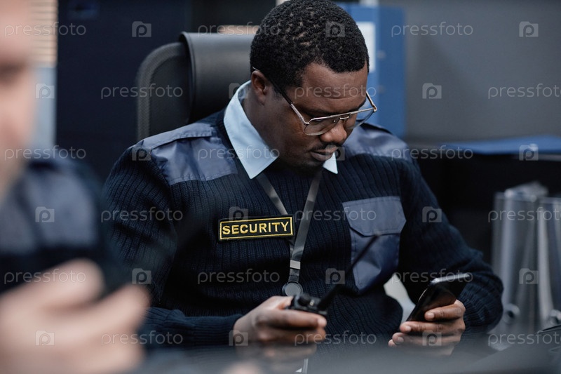 Чернокожий мужчина среднего возраста отслеживает устройства безопасности, сидя в помещении