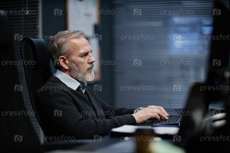 Мужчина средних лет, работающий на ноутбуке в современной офисной обстановке