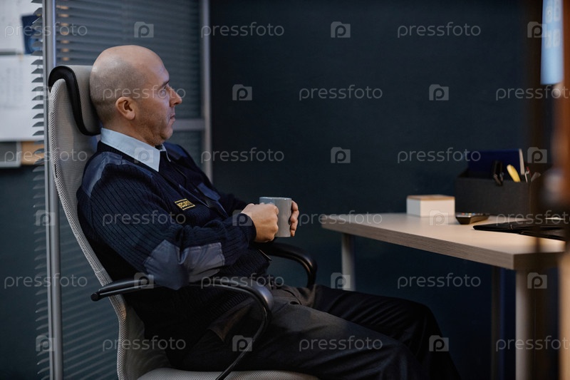 Мужчина средних лет сидит за рабочим столом, пьет кофе в офисной обстановке