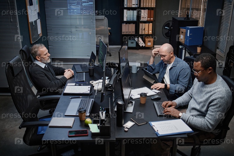 Мультиэтнические мужчины среднего возраста, сотрудничающие на ноутбуках в современном офисном рабочем пространстве