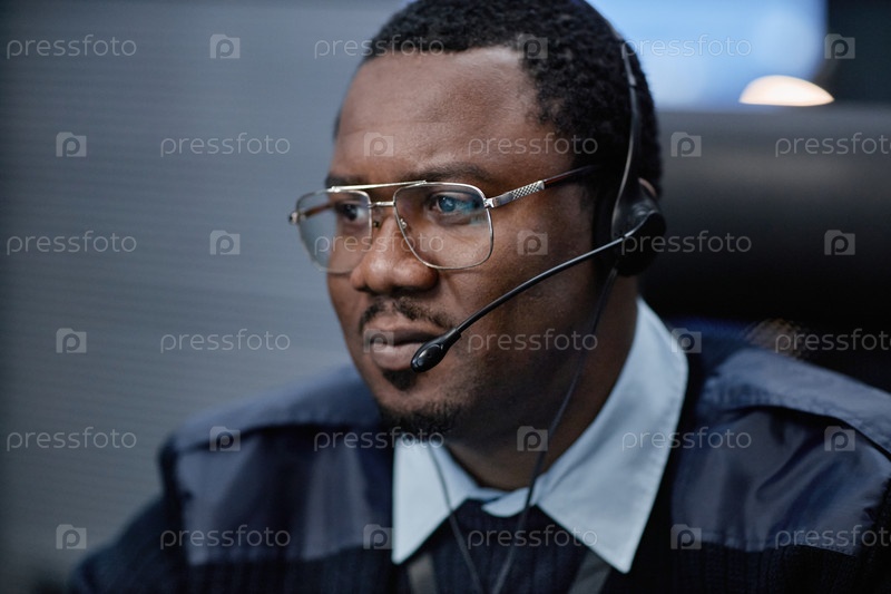 Портрет чернокожего мужчины среднего возраста, носящего наушники и работающего в колл-центре