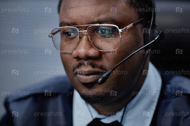 Портрет чернокожего мужчины среднего возраста, носящего наушники и работающего в офисе