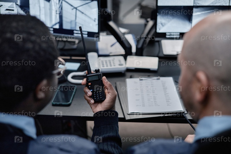 Молодой взрослый чернокожий мужчина и мужчина среднего возраста отслеживают камеры видеонаблюдения