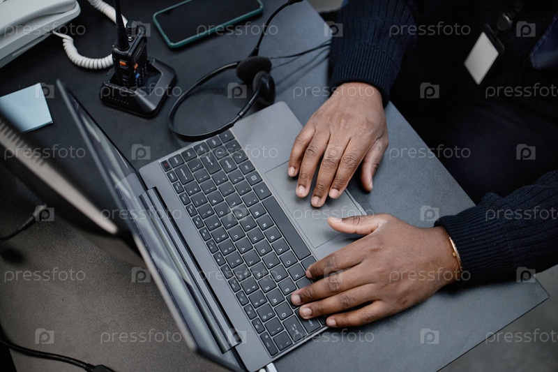 Чернокожий мужчина средних лет печатает на ноутбуке в офисе рабочий стол