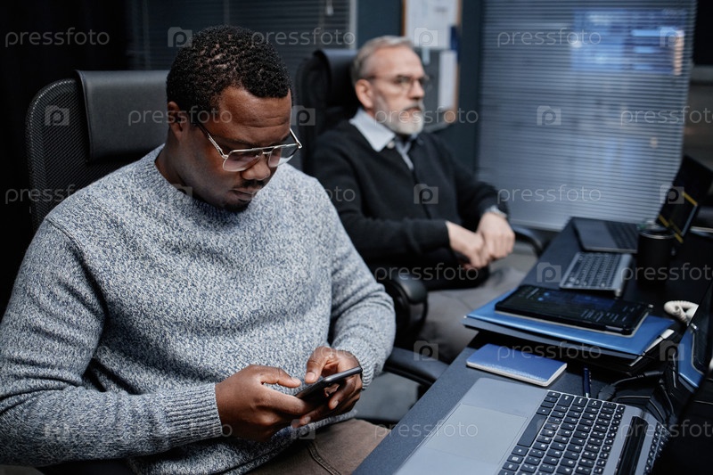 Молодой чернокожий человек использует смартфон, в то время как мужчина средних лет работает